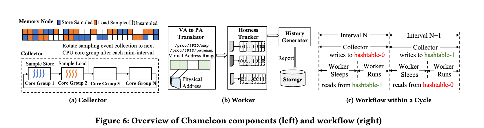 - Collector(收集器):利用现代 CPU 的 PEBS 机制,采集与内存访问相关的硬件性能事件,包括需求加载的末级缓存(LLC)缺失事件(MEM_LOAD_RETIRED.L3_MISS)与需求存储的 TLB 缺失事件(MEM_INST_RETIRED.STLB_MISS_STORES,受硬件限制,无精确的存储 LLC 缺失事件)。采样记录包含内存访问事件对应的进程 ID(PID)与虚拟内存地址。